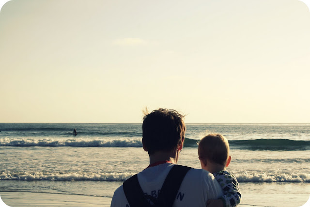 With his dad. Watching the waves crash and clinging tightly to comfort. |